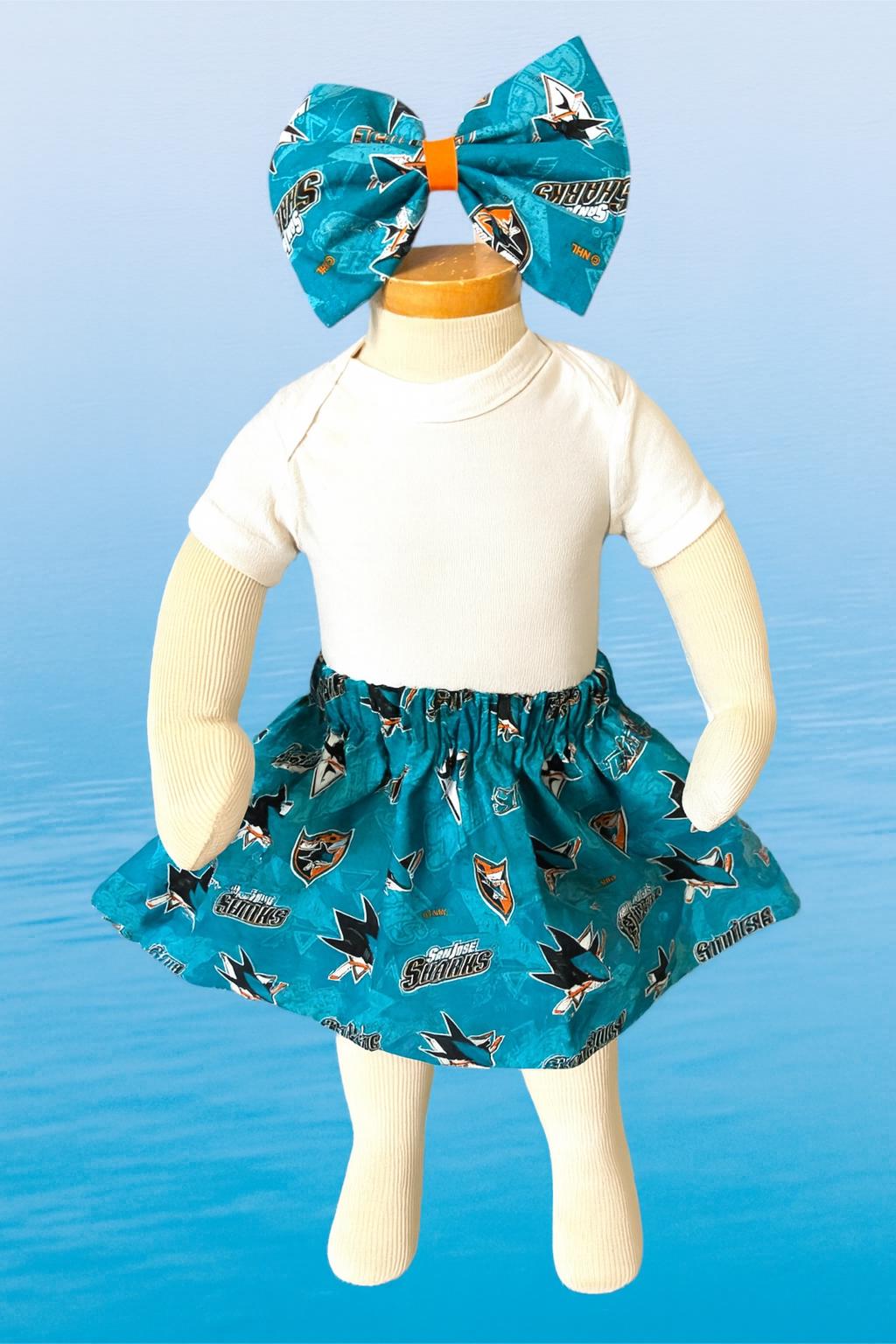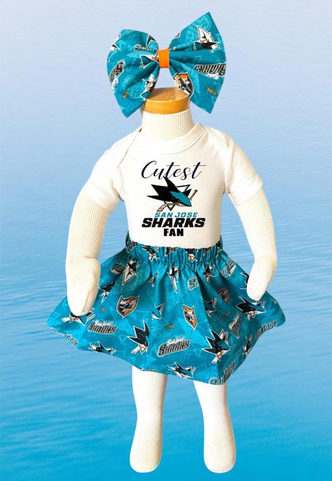 Crafted with the tiniest Sharks fan in mind, this adorable San Jose Sharks outfit for babies is the perfect way to kick off hockey season early. Whether you're hosting a Sharks-themed baby shower or gearing up for game day, this outfit will have your little one looking game-ready in no time. Made with soft and comfortable materials, it ensures your baby stays cozy while cheering on their favorite team. The iconic Sharks logo emblazoned on the outfit adds a touch of team spirit to your baby's wardrobe. Celebrate the hockey season in style with this cute ensemble that is sure to win the hearts of Sharks fans of all ages Custom made to order, Choose your shirt design and fabric choice in personalization